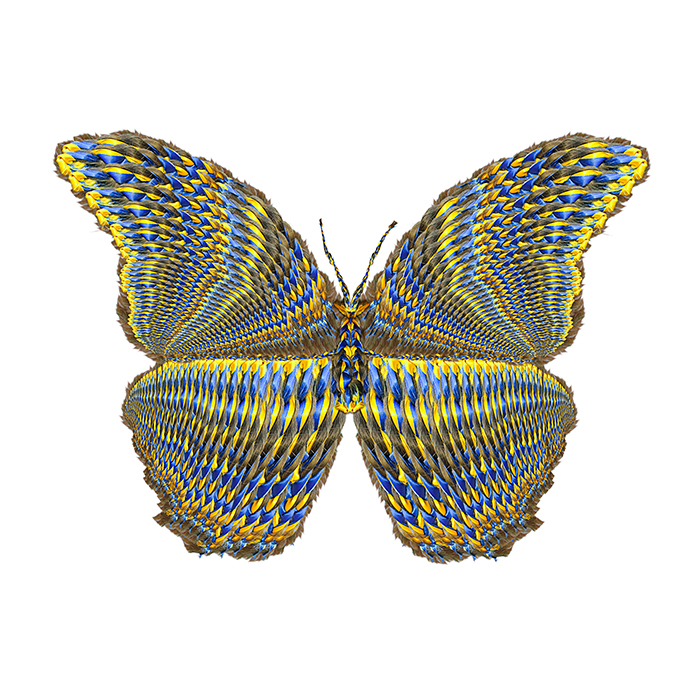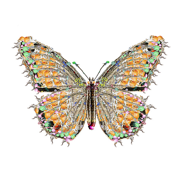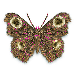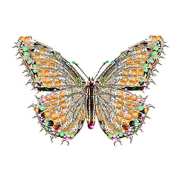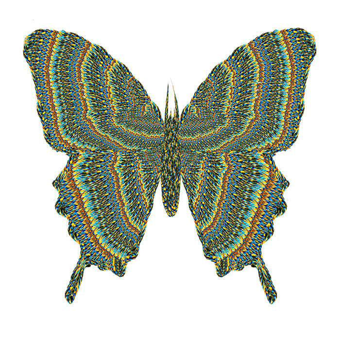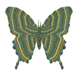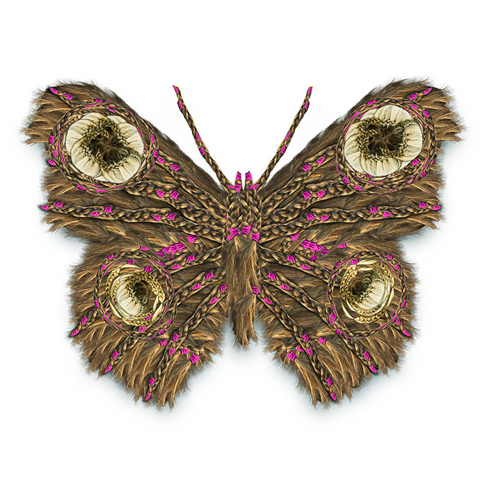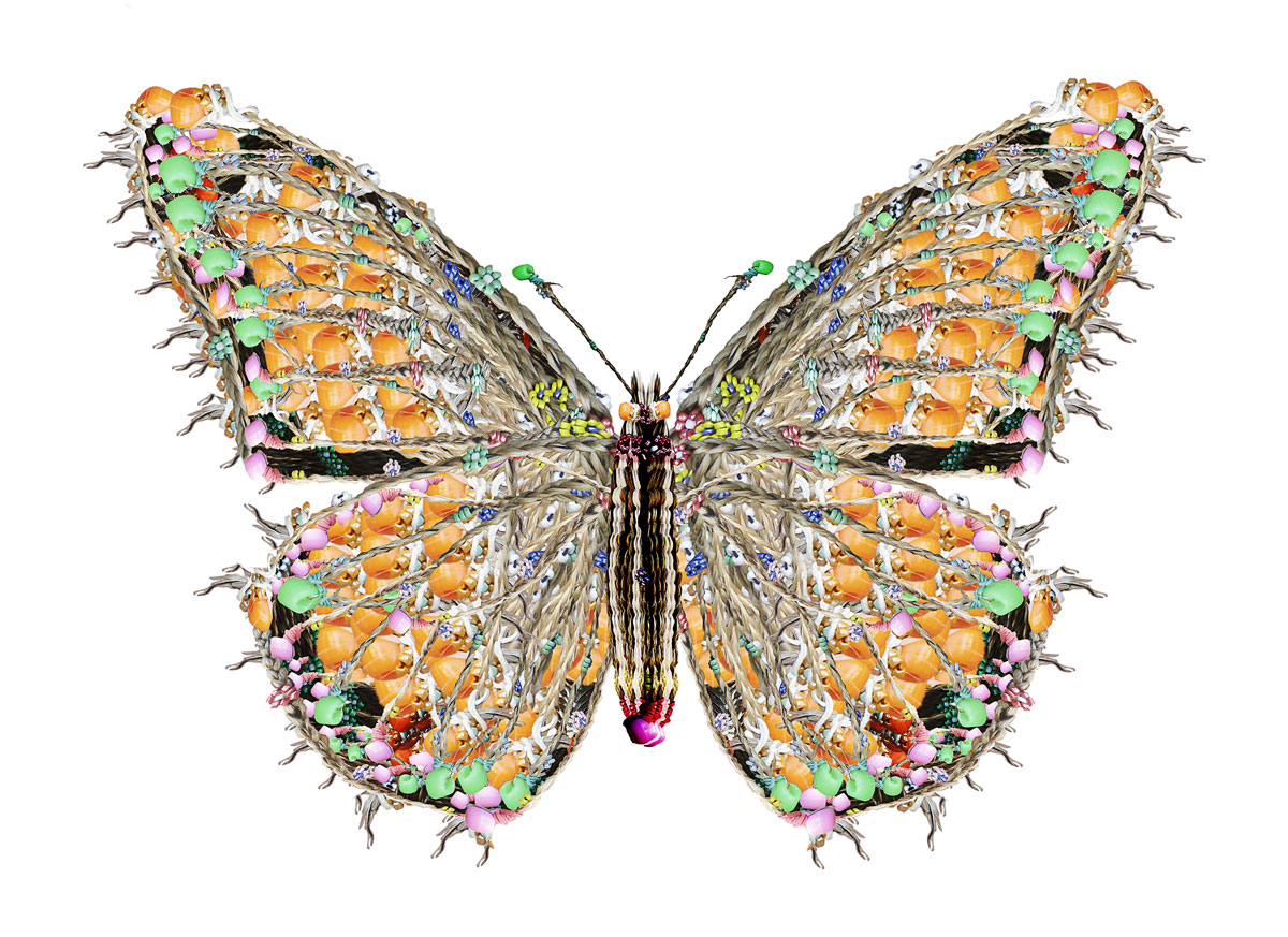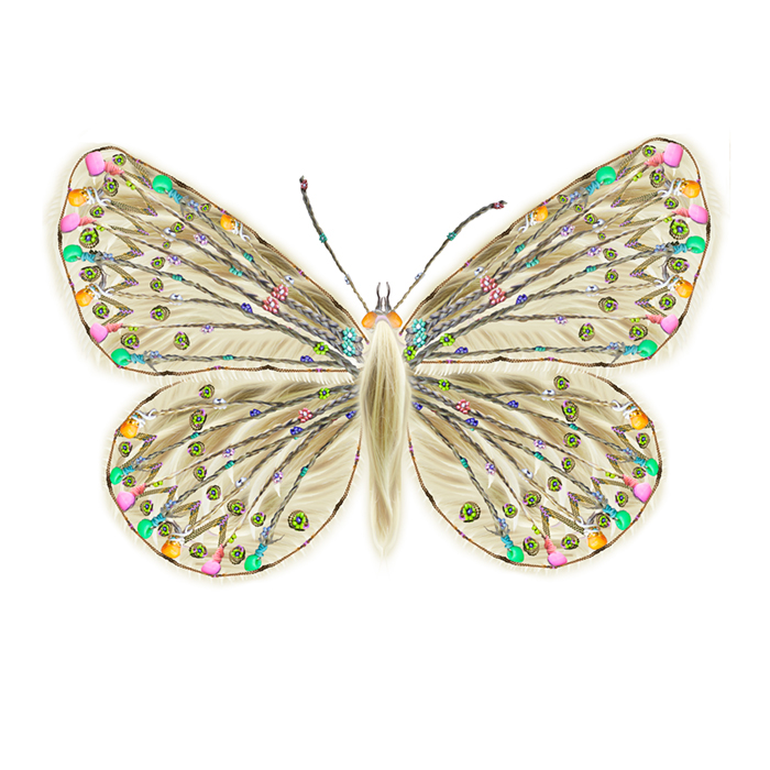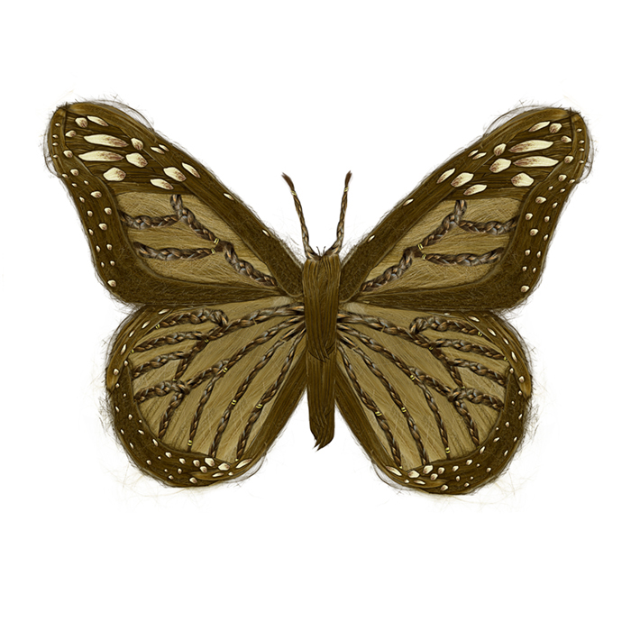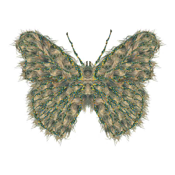 The monarch butterfly has a migratory route between the northeastern United States and central Mexico, the two cultures between which I work and live with my daughters. "Mariposas" incorporates elements of Victorian design and hairwork, Mexican folk art and collage, and my own maternal instinct for keepsakes. This imagery has been created through digital collage and manipulation of my daughters' and my scanned and photographed hair, replete with girlish embellishments, in a process I term "digital embroidery."